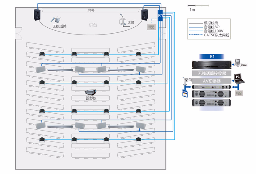 根据多功能会议室的基本功能要求,建议配置如下系统:
